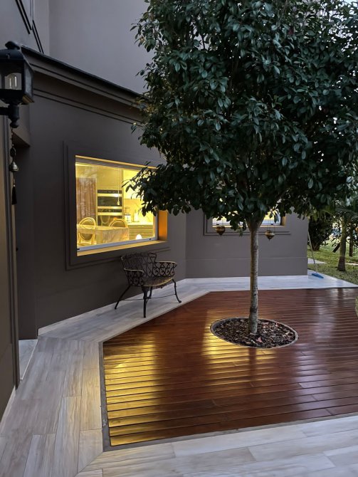 Galería con parrilla completamente revestida en acero y horno.
