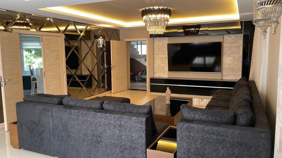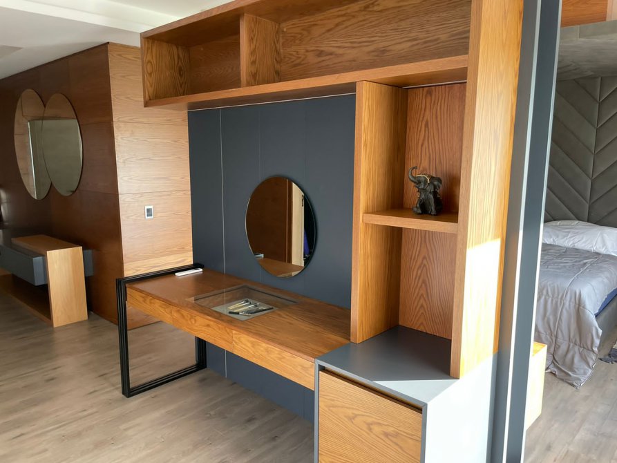Amplio living con muebles y revestimientos hechos a medida.
